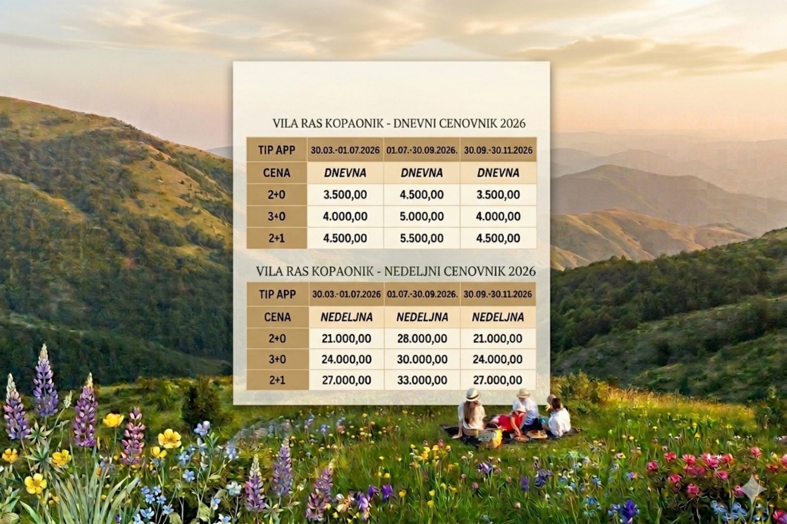 Након успешно завршене зимске сезоне, вила „Рас“ представља ценовник за пролеће-лето 2026. године, намењен љубитељима активног одмора на Копаонику.